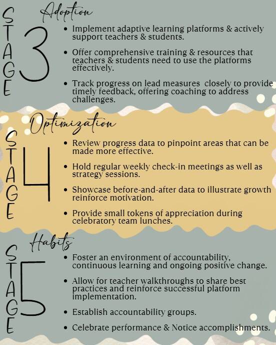 To truly support the academic success of special education students, we must integrate adaptive learning technology into our educational approach. Its not just a beneficial strategy for supporting special education students – it is an essential one. By combining an influencer strategy focused on emotional engagement, practical support, and commitment with the structured execution approach of 4DX, we can bridge gaps, boost student’s confidence, and help students achieve academic standards that may have felt like unrealistic expectations. It enables us to create an environment where adaptive learning becomes a vital tool for delivering personalized education, ensuring every student has the opportunity to thrive. By making the 4DX disciplines a habit, we will set ourselves up for success with any wildly important goal we set in the future.